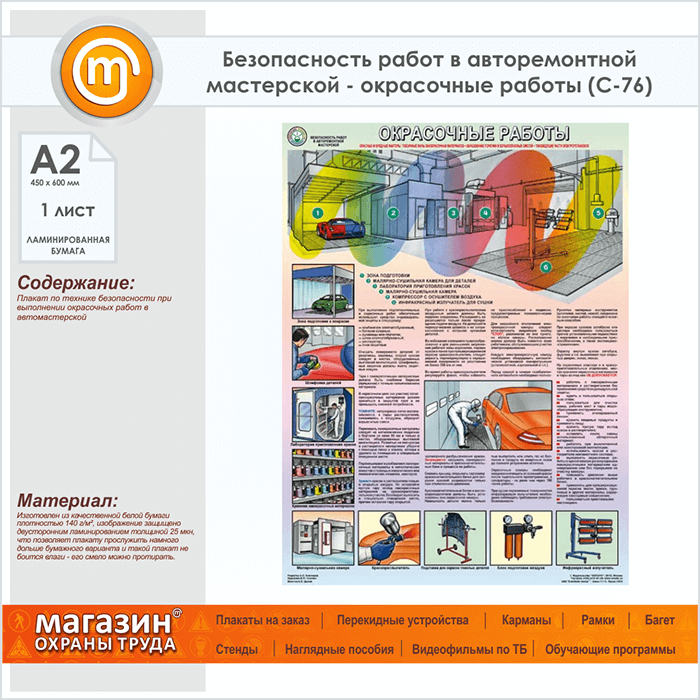 Плакат «Безопасность работ в авторемонтной мастерской - окрасочные работы» (С-76, ламинированная бумага, А2, 1 лист) в Твери купить