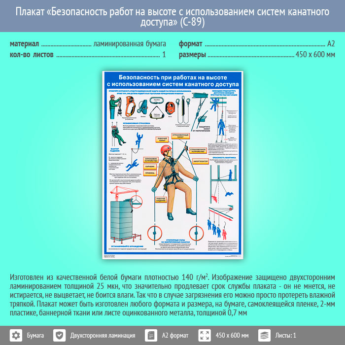 Плакат «Безопасность работ на высоте с использованием систем канатного доступа» (С-89, ламинированная бумага, А2, 1 лист) в Твери купить