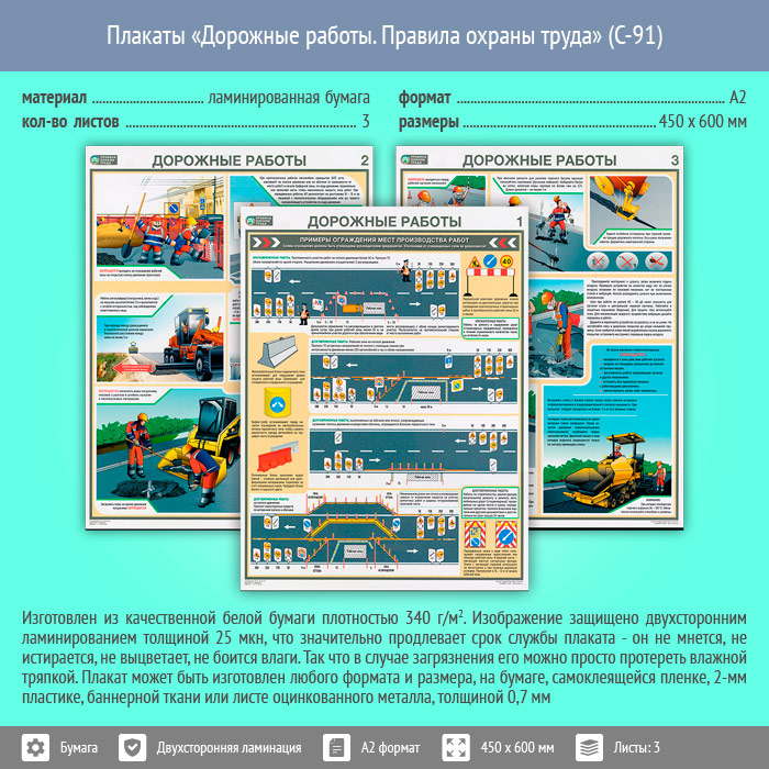 Плакаты «Дорожные работы. Правила охраны труда» (С-91, ламинированная бумага, А2, 3 листа) в Твери купить