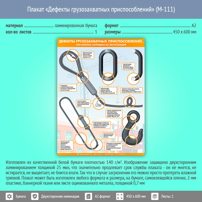 Плакат «Дефекты грузозахватных приспособлений» (М-111, ламинированная бумага, А2, 1 лист) в Твери купить