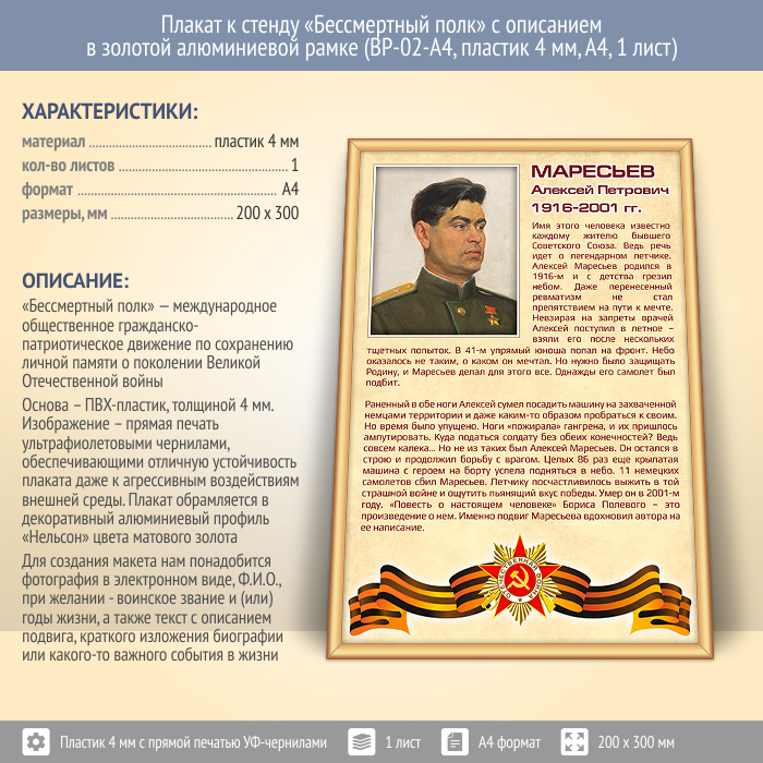 Плакат к стенду «Бессмертный полк» с описанием в золотой (матовой) алюминиевой рамке (BP-02-A4, пластик 4 мм, А4, 1 лист) в Твери купить