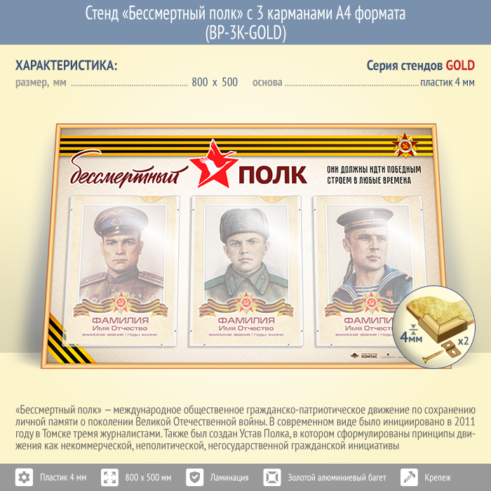Стенд «Бессмертный полк» с 3 карманами А4 формата (BP-3K-GOLD) в Твери купить