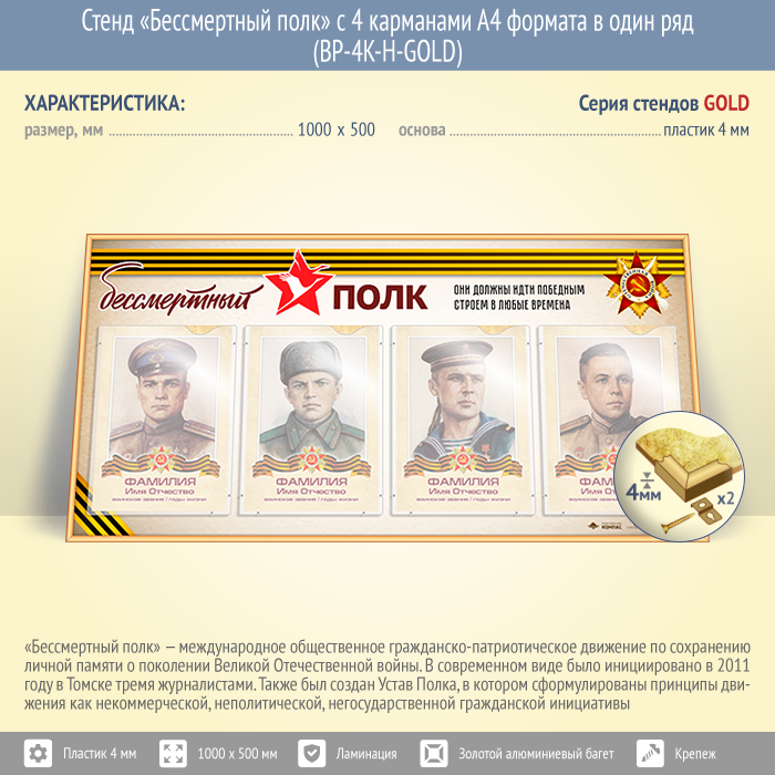 Стенд «Бессмертный полк» с 4 карманами А4 формата в один ряд (BP-4K-H-GOLD) в Твери купить