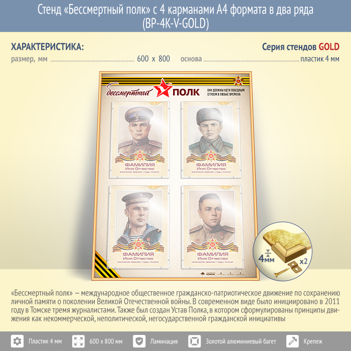 Стенд «Бессмертный полк» с 4 карманами А4 формата в два ряда (BP-4K-V-GOLD) в Твери купить