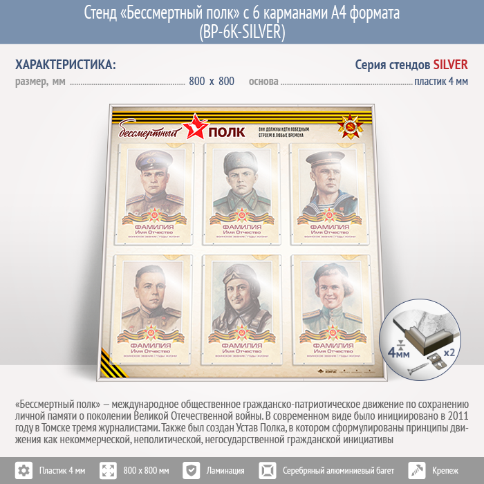 Стенд «Бессмертный полк» с 6 карманами А4 формата (BP-6K-SILVER) в Твери купить