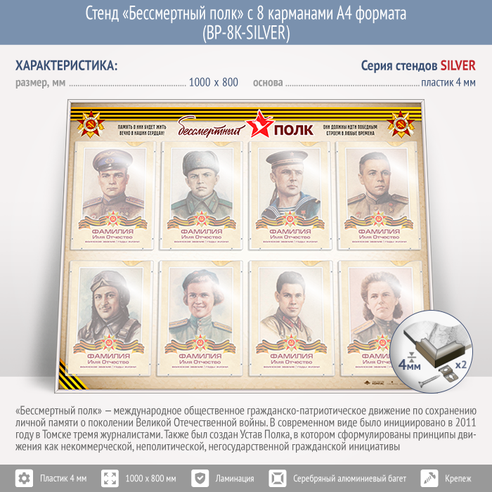 Стенд «Бессмертный полк» с 8 карманами А4 формата (BP-8K-SILVER) в Твери купить