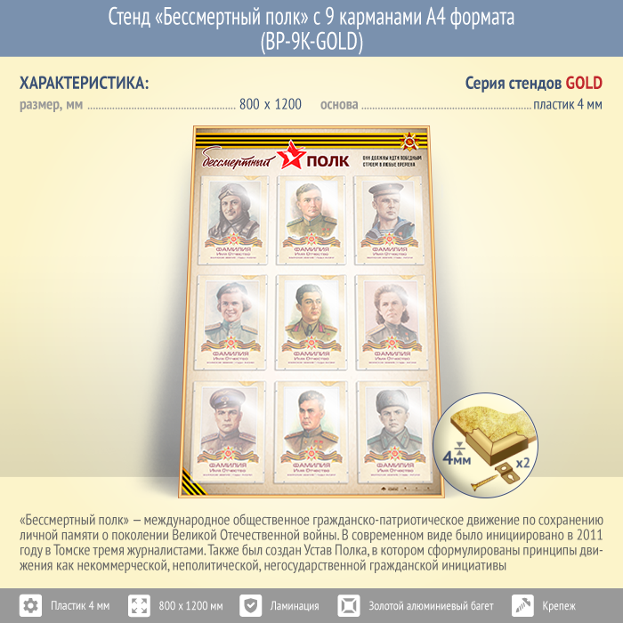 Стенд «Бессмертный полк» с 9 карманами А4 формата (BP-9K-GOLD) в Твери купить