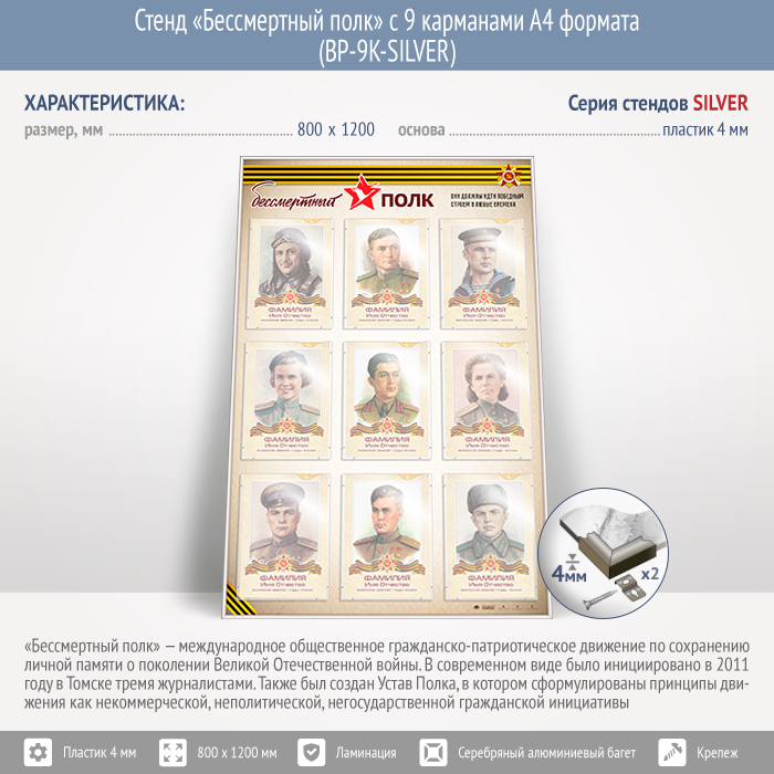 Стенд «Бессмертный полк» с 9 карманами А4 формата (BP-9K-SILVER) в Твери купить