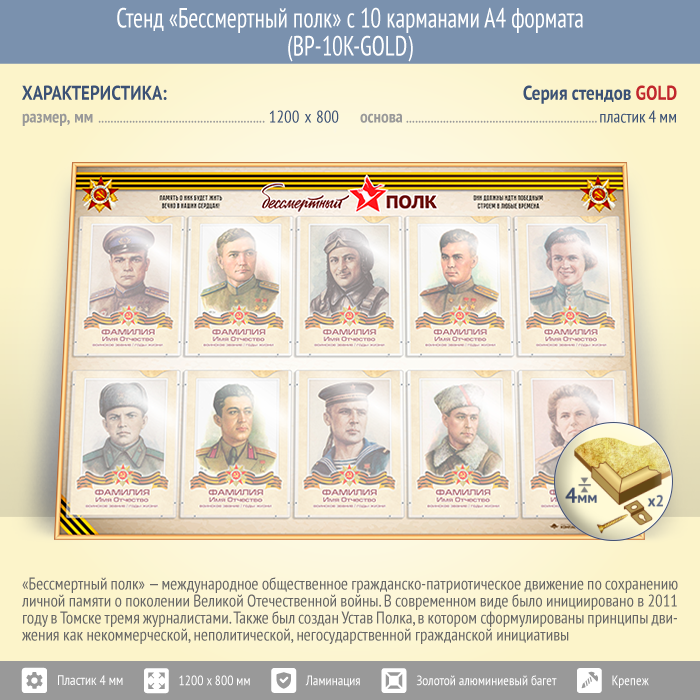 Стенд «Бессмертный полк» с 10 карманами А4 формата (BP-10K-GOLD) в Твери купить