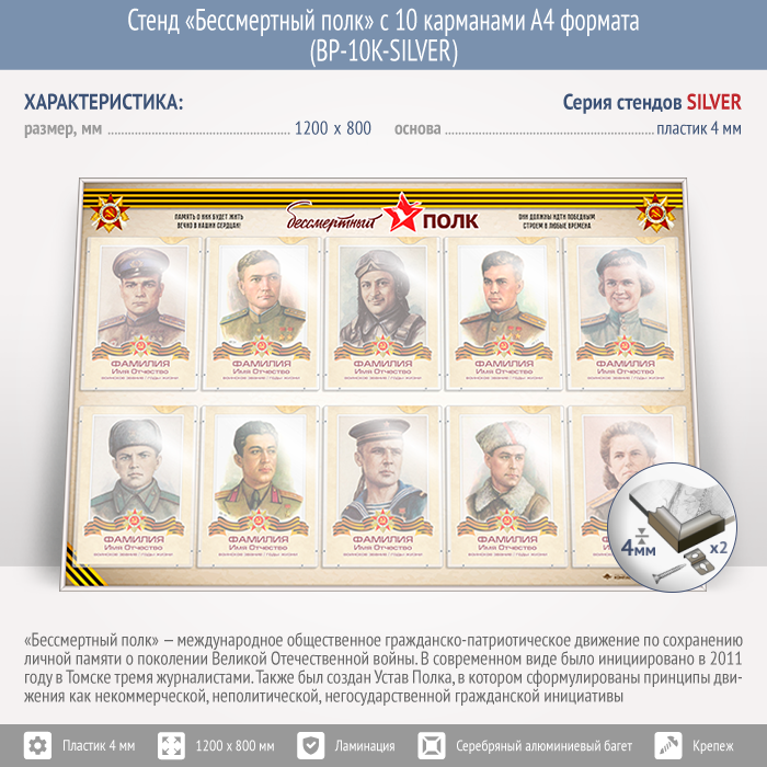 Стенд «Бессмертный полк» с 10 карманами А4 формата (BP-10K-SILVER) в Твери купить