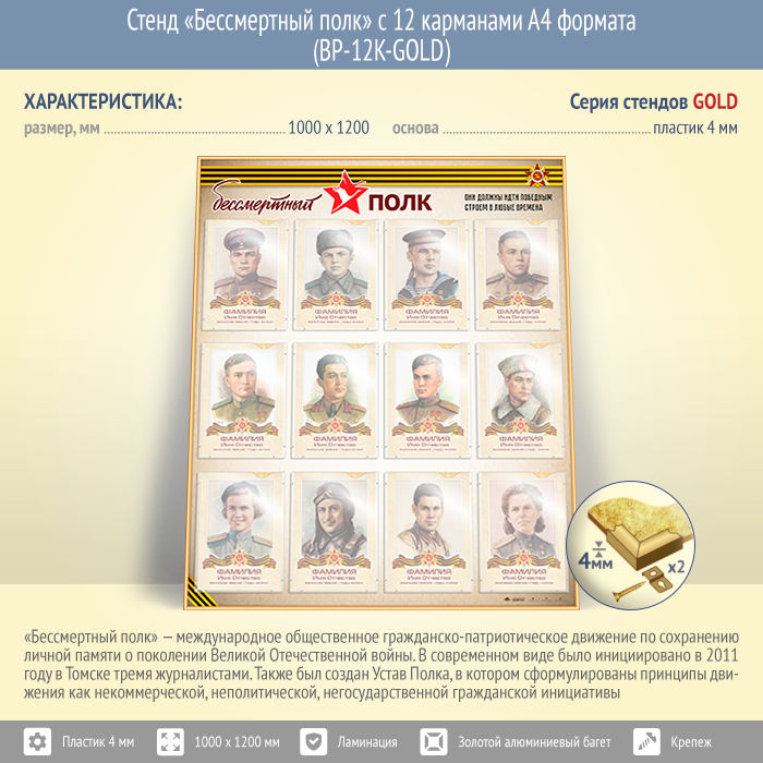 Стенд «Бессмертный полк» с 12 карманами А4 формата (BP-12K-GOLD) в Твери купить