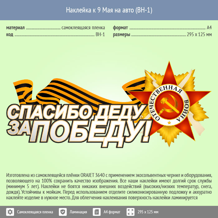 Наклейка к 9 Мая на авто А4 формата (BH-1) в Твери купить