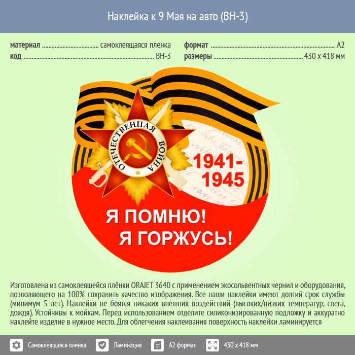 Наклейка к 9 Мая на авто А2 формата (BH-3) в Твери купить
