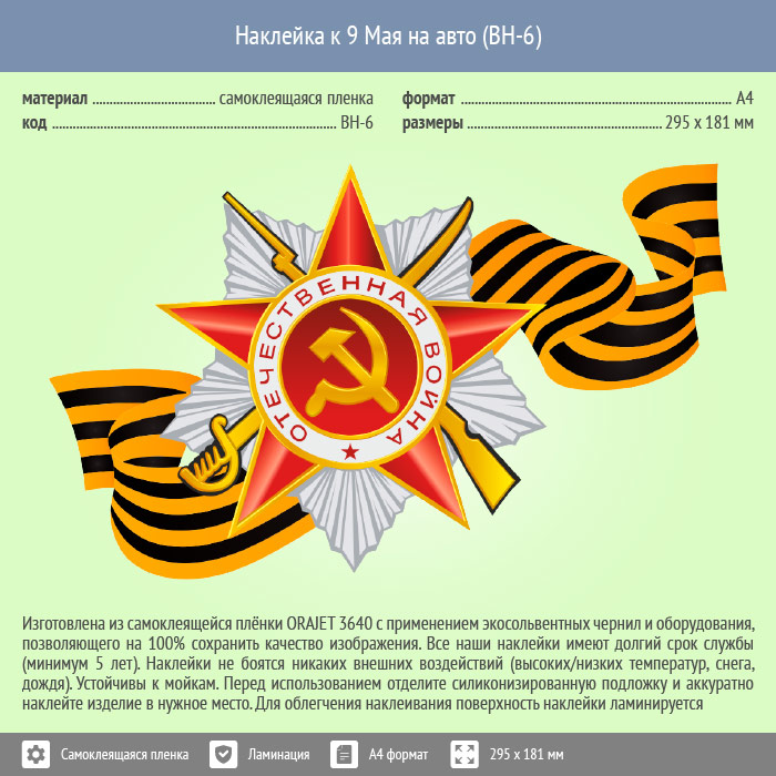 Наклейка к 9 Мая на авто А4 формата (BH-6) в Твери купить