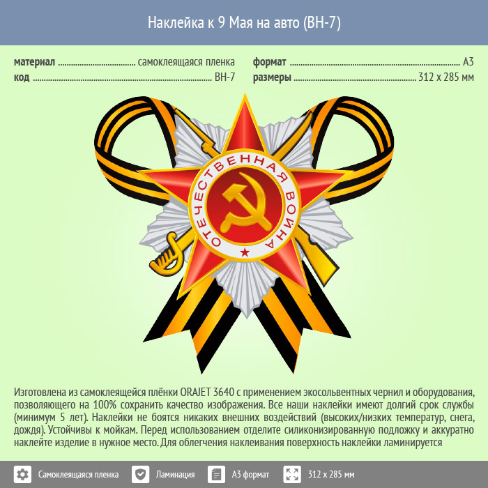 Наклейка к 9 Мая на авто А3 формата (BH-7) в Твери купить