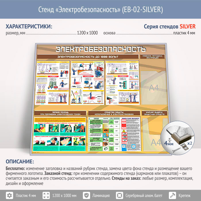 Стенд «Электробезопасность до 1000 вольт» с плоским и объемным карманами (EB-02-SILVER) в Твери купить
