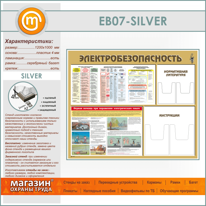 Стенд «Электробезопасность» с 4 объемными карманами (EB-07-SILVER) в Твери купить