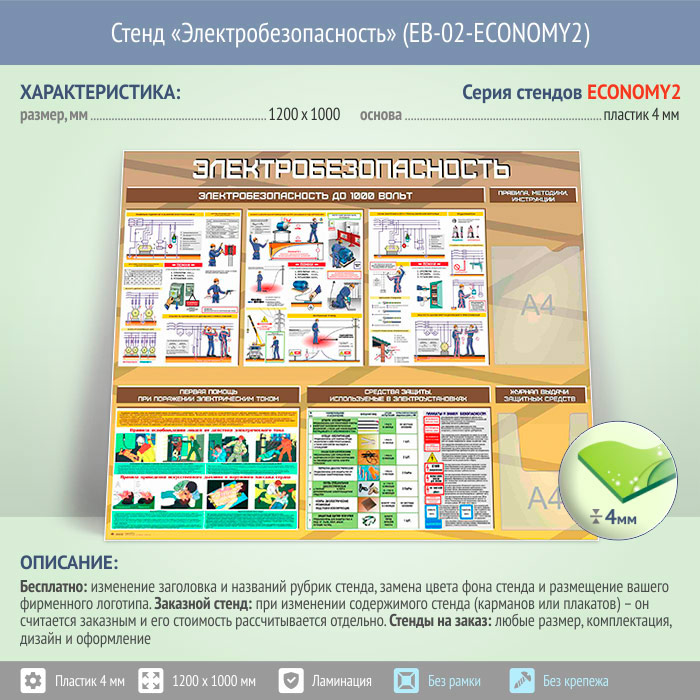 Стенд «Электробезопасность до 1000 вольт» с плоским и объемным карманами (EB-02-ECONOMY2) в Твери купить