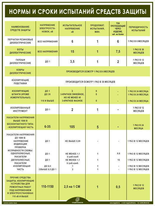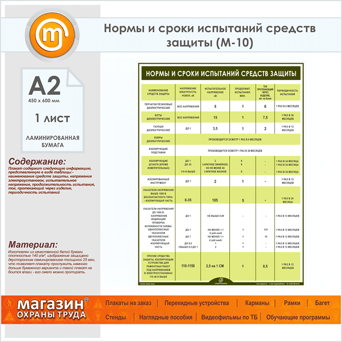 Плакат «Нормы и сроки испытаний средств защиты» (М-10, ламинированная бумага, А2, 1 лист) в Твери купить