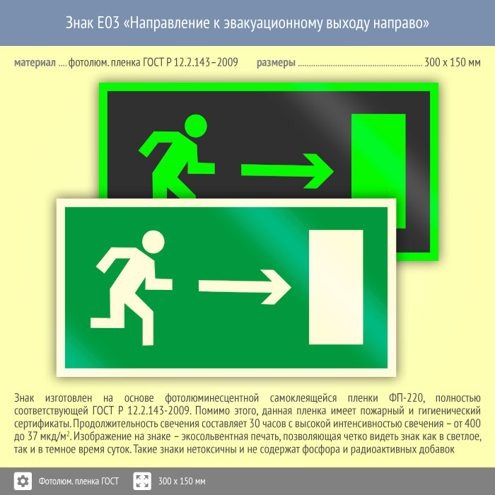 Знак E03 «Направление к эвакуационному выходу направо» (фотолюминесцентная пленка ГОСТ 34428-2018, 300х150 мм) в Твери купить