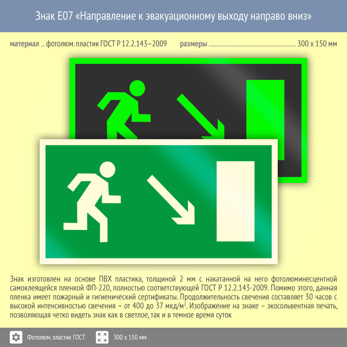 Знак E07 «Направление к эвакуационному выходу направо вниз» (фотолюминесцентный пластик ГОСТ 34428-2018, 300х150 мм) в Твери купить