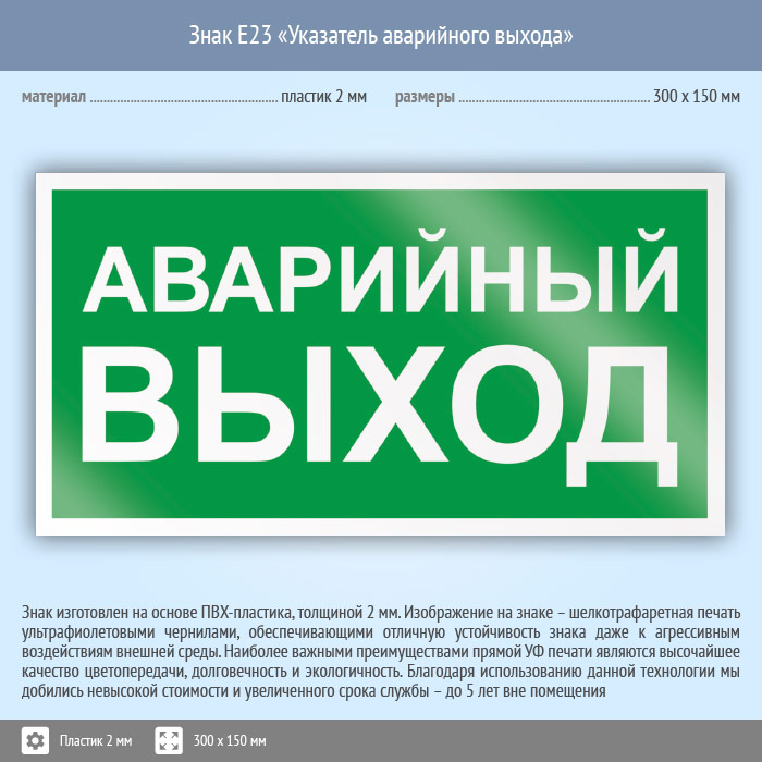 Знак E23 «Указатель аварийного выхода» (пластик, 300х150 мм) в Твери купить