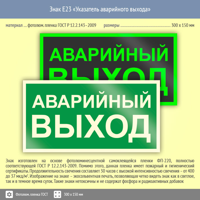 Знак E23 «Указатель аварийного выхода» (фотолюминесцентная пленка ГОСТ 34428-2018, 300х150 мм) в Твери купить