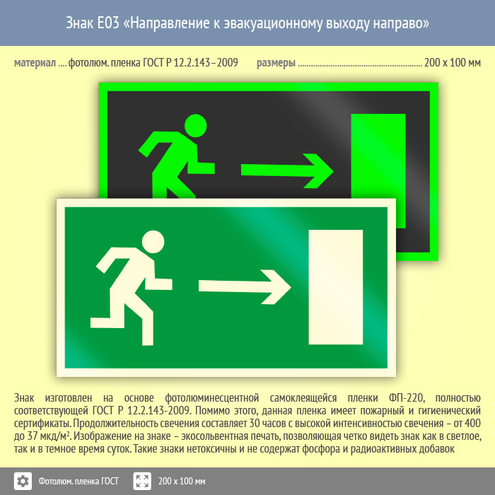 Знак E03 «Направление к эвакуационному выходу направо» (фотолюминесцентная пленка ГОСТ 34428-2018, 200х100 мм) в Твери купить