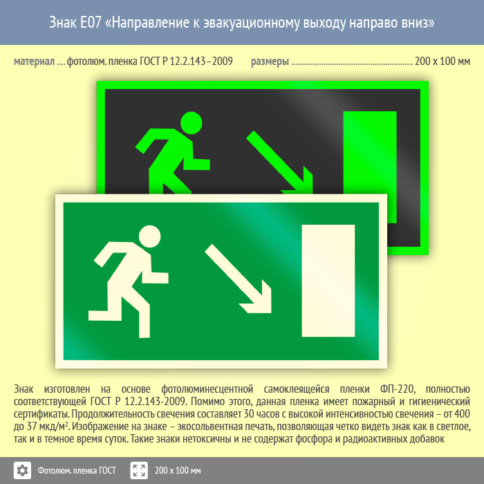 Знак E07 «Направление к эвакуационному выходу направо вниз» (фотолюминесцентная пленка ГОСТ 34428-2018, 200х100 мм) в Твери купить