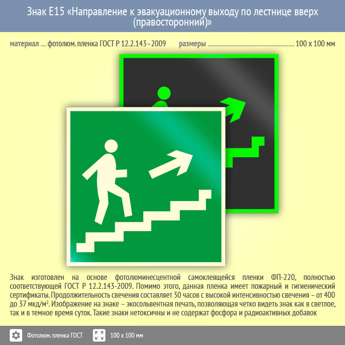 Знак E15 «Направление к эвакуационному выходу по лестнице вверх (правосторонний)» (фотолюминесцентная пленка ГОСТ 34428-2018, 100х100 мм) в Твери купить