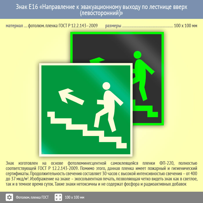 Знак E16 «Направление к эвакуационному выходу по лестнице вверх (левосторонний)» (фотолюминесцентная пленка ГОСТ 34428-2018, 100х100 мм) в Твери купить