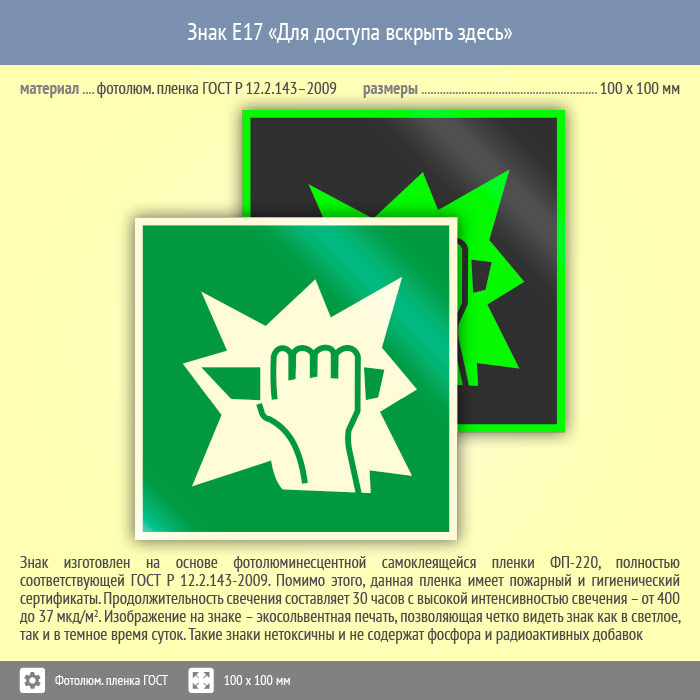 Знак E17 «Для доступа вскрыть здесь» (фотолюминесцентная пленка ГОСТ 34428-2018, 100х100 мм) в Твери купить