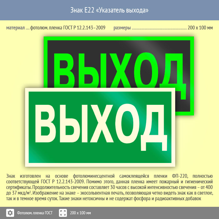 Знак E22 «Указатель выхода» (фотолюминесцентная пленка ГОСТ 34428-2018, 200х100 мм) в Твери купить