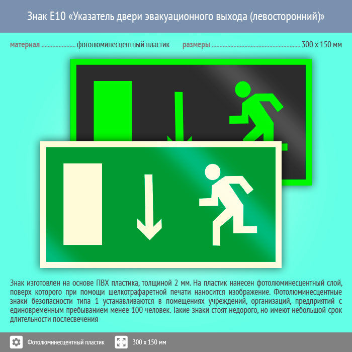 Знак E10 «Указатель двери эвакуационного выхода (левосторонний)» (фотолюминесцентный пластик, 300х150 мм) в Твери купить