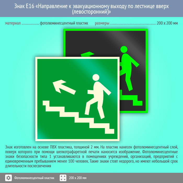 Знак E16 «Направление к эвакуационному выходу по лестнице вверх (левосторонний)» (фотолюминесцентный пластик, 200х200 мм) в Твери купить