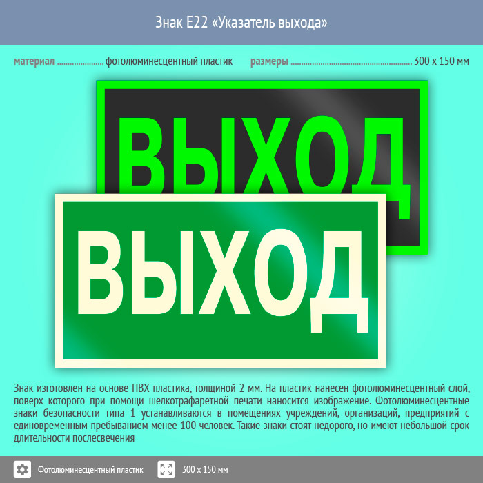 Знак E22 «Указатель выхода» (фотолюминесцентный пластик, 300х150 мм) в Твери купить