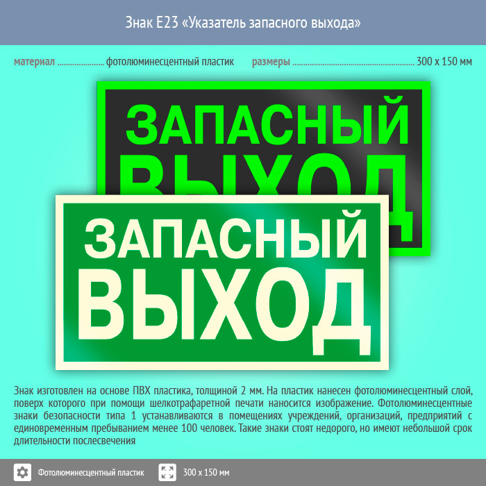 Знак E23 «Указатель запасного выхода» (устаревший) (фотолюминесцентный пластик, 300х150 мм) в Твери купить