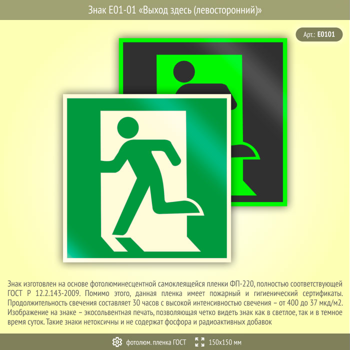 Знак E01-01 «Выход здесь (левосторонний)» (фотолюминесцентная пленка ГОСТ 34428-2018, 150х150 мм) в Твери купить