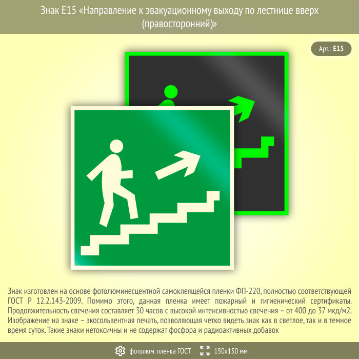 Знак E15 «Направление к эвакуационному выходу по лестнице вверх (правосторонний)» (фотолюминесцентная пленка ГОСТ 34428-2018, 150х150 мм) в Твери купить