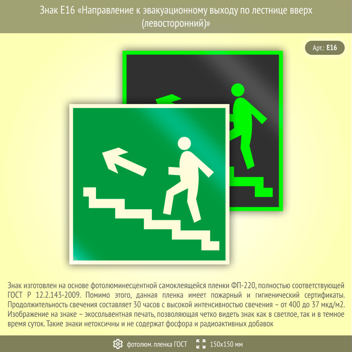 Знак E16 «Направление к эвакуационному выходу по лестнице вверх (левосторонний)» (фотолюминесцентная пленка ГОСТ 34428-2018, 150х150 мм) в Твери купить