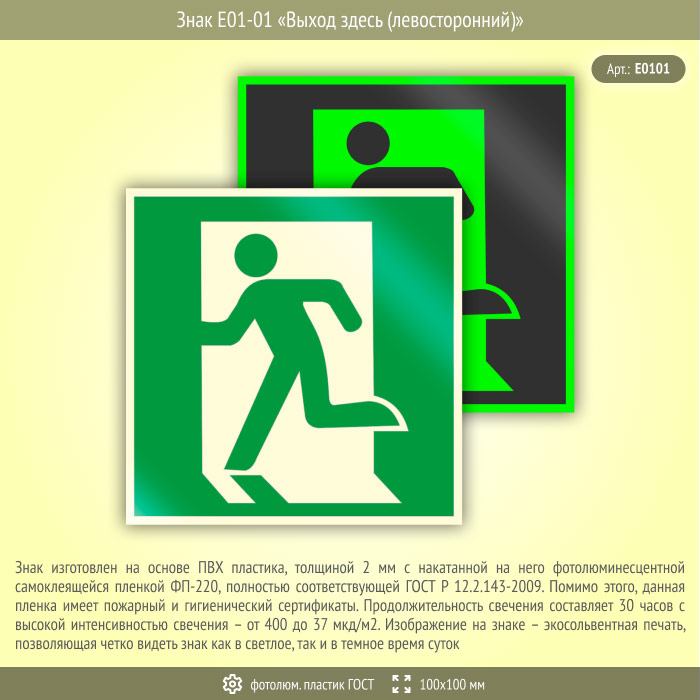 Знак E01-01 «Выход здесь (левосторонний)» (фотолюминесцентный пластик ГОСТ 34428-2018, 100х100 мм) в Твери купить
