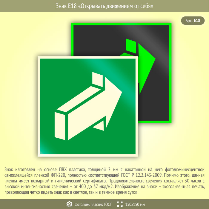 Знак E18 «Открывать движением от себя» (фотолюминесцентный пластик ГОСТ 34428-2018, 150х150 мм) в Твери купить