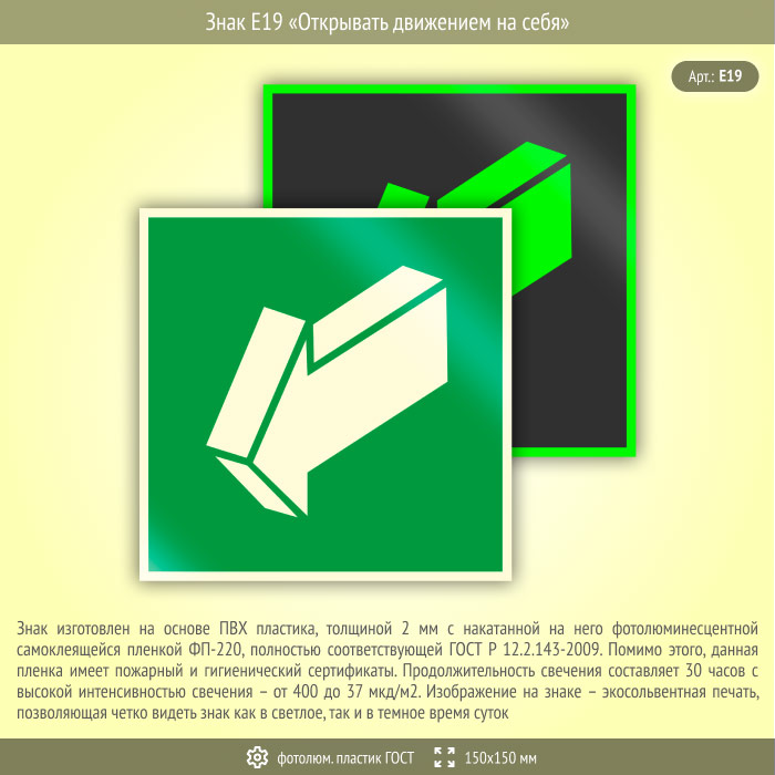 Знак E19 «Открывать движением на себя» (фотолюминесцентный пластик ГОСТ 34428-2018, 150х150 мм) в Твери купить