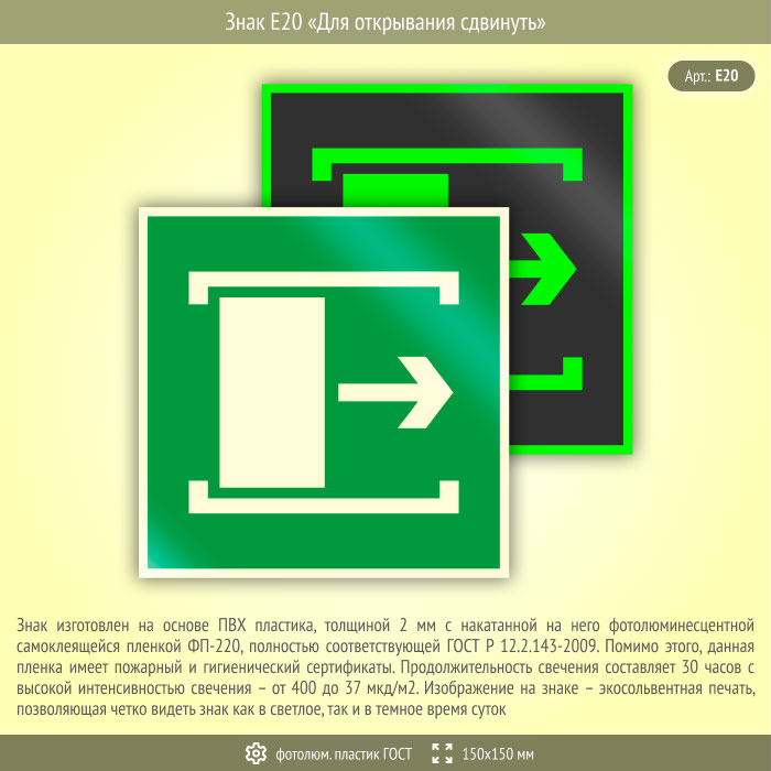 Знак E20 «Для открывания сдвинуть» (фотолюминесцентный пластик ГОСТ 34428-2018, 150х150 мм) в Твери купить