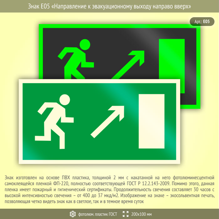 Знак E05 «Направление к эвакуационному выходу направо вверх» (фотолюминесцентный пластик ГОСТ 34428-2018, 200х100 мм) в Твери купить