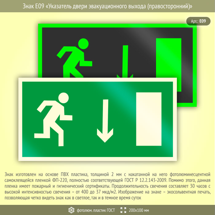 Знак E09 «Указатель двери эвакуационного выхода (правосторонний)» (фотолюминесцентный пластик ГОСТ 34428-2018, 200х100 мм) в Твери купить