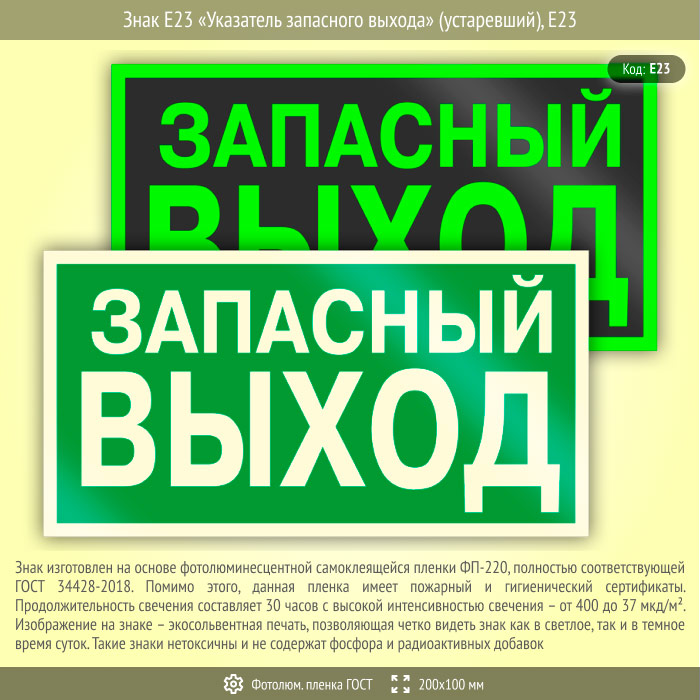 Знак E23 «Указатель запасного выхода» (устаревший) (фотолюминесцентная пленка ГОСТ 34428-2018, 200х100 мм) в Твери купить