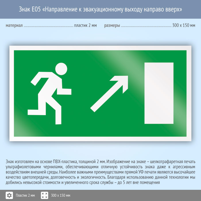 Знак E05 «Направление к эвакуационному выходу направо вверх» (пластик, 300х150 мм) в Твери купить