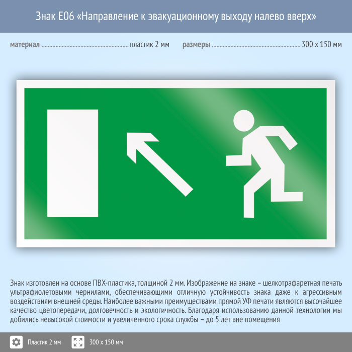 Знак E06 «Направление к эвакуационному выходу налево вверх» (пластик, 300х150 мм) в Твери купить