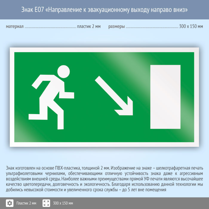 Знак E07 «Направление к эвакуационному выходу направо вниз» (пластик, 300х150 мм) в Твери купить